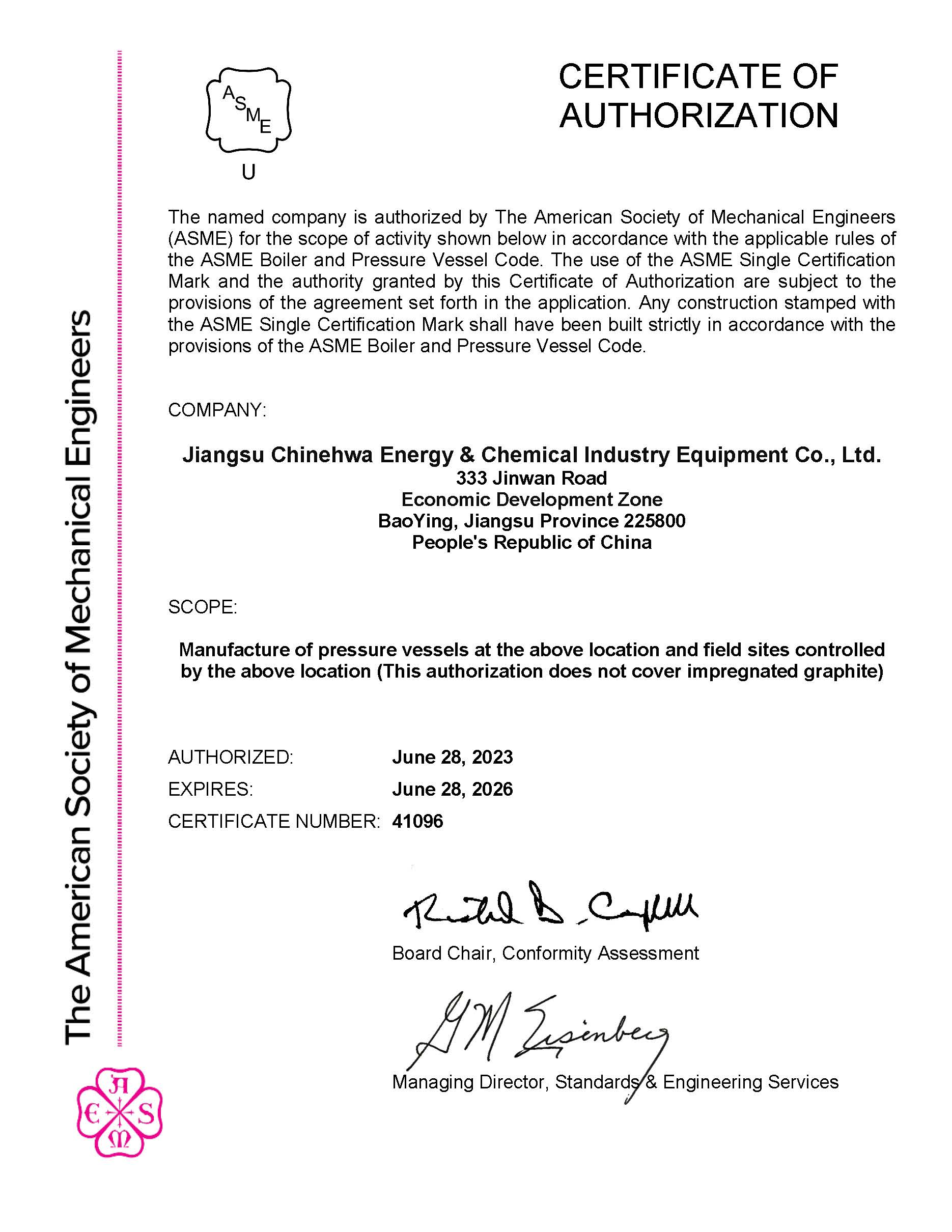 2023年5月18日,ASME聯(lián)檢小組如期到成華公司制造基地-江蘇成華能源化工設(shè)備有限公司進行為期兩天的ASME換證審核,此次審核主要針對U和U2鋼印,審核內(nèi)容包括文件體系審核、設(shè)計人員答辯、車間考察等等。ASME聯(lián)檢小組對于此次的審核很滿意,公司圓滿完成換證,于2023年6月24日獲得U和U2鋼印證書。